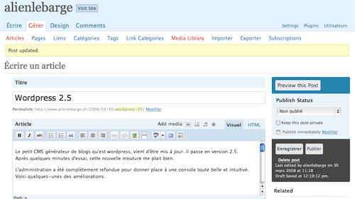 Le petit CMS générateur de blogs qu’est wordpress, vient d’être mis à jour. Il passe en version 2.5.